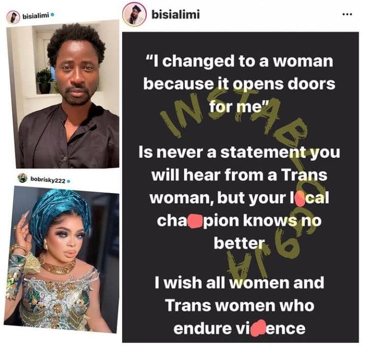 Bisi Alimi reacting to Bobrisky’s submission has said that you will not hear from a Trans woman,making the claims Bob is making.