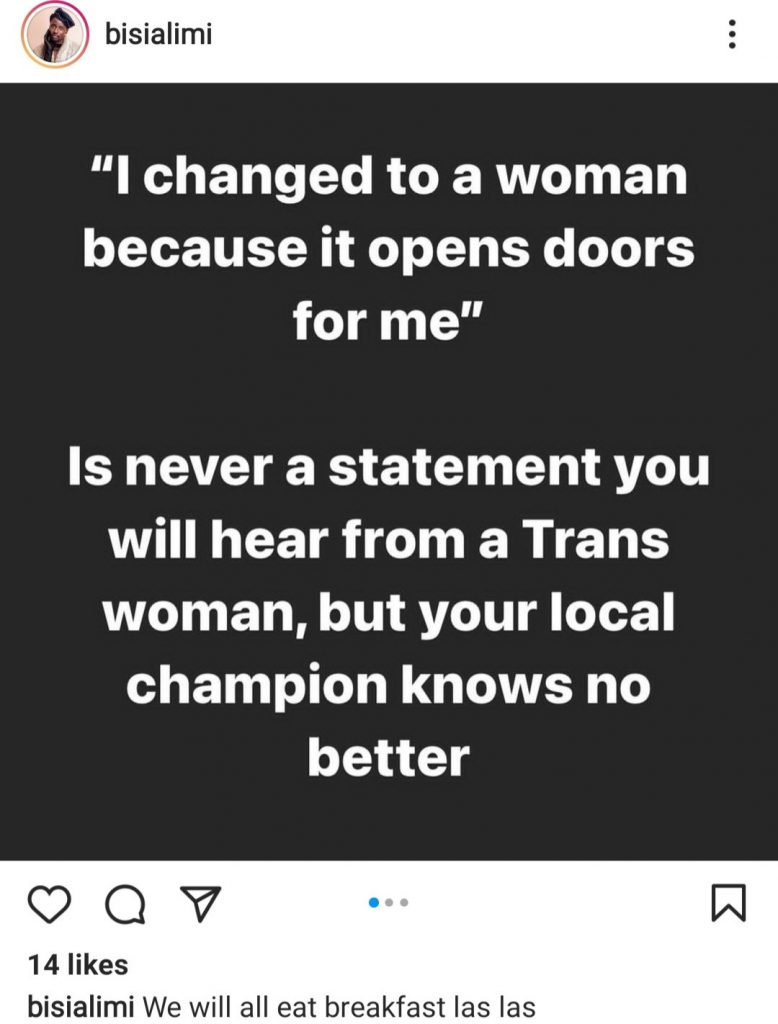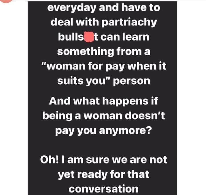 Bisi Alimi said that he wishes all women and Trans women who endure violence every day and have to deal with patriarchy bullshit can learn something from a woman for pay when it suits you person asking what happens if being a woman doesn’t pay you anymore.