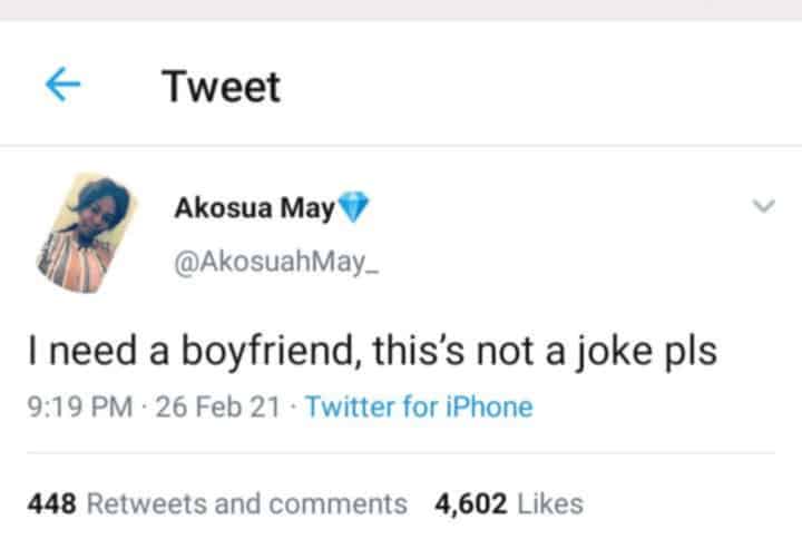 A beautiful lady on Twitter, Akosuah May, with the username, @AkosuahMay_, has cried out for a boyfriend as she notes on her social media her needs.