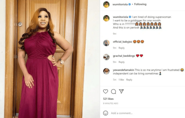 On her Instagram account,Wunmi Toriola has revealed she wants to be a gold digger and cease being a superwoman.