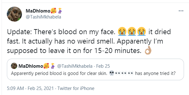 The lady, identified as Tashi Mkhabela has revealed the usefulness of blood from ladies period.