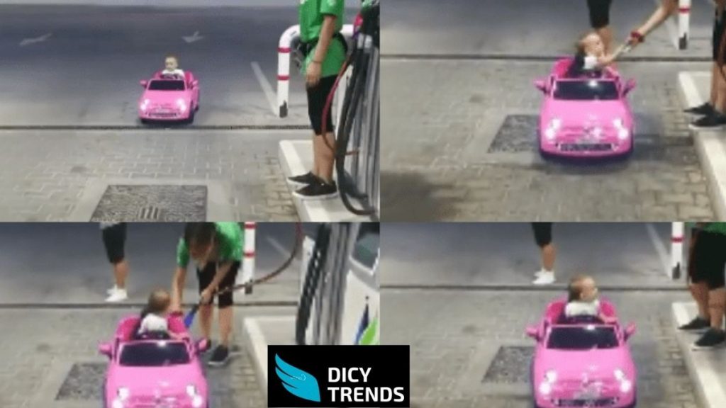 A video making trends on the internet has a beautiful little girl driving her toy to a filling station to purchase petrol.