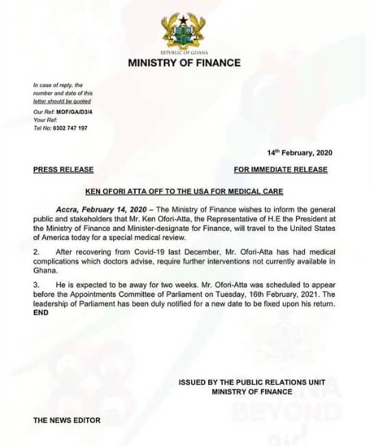 Accra, February 14, 2020 – The Ministry of Finance wishes to inform the general public and stakeholders that Mr. Ken Ofori-Atta, the Representative of H.E the President at the Ministry of Finance and Minister-designate for Finance, will travel to the United States of America today for a special medical review.