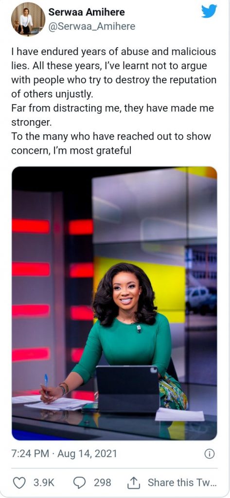 The GHOne television presenter Serwaa Amihere has finally reacted.